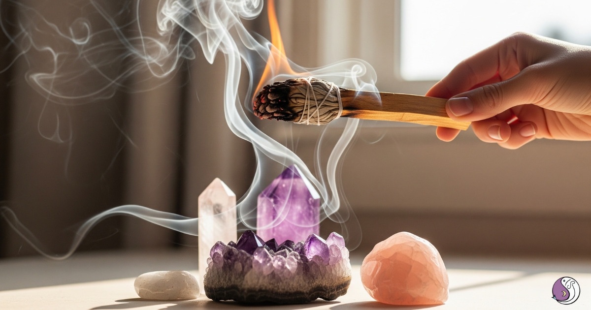 使用鼠尾草、聖木或天然香材點燃,讓煙霧繞行水晶周圍。這是一種古老且溫柔的淨化方式,能穿透性清除能量雜質。